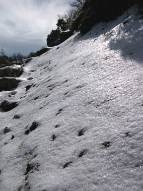 春の雪面 厳冬期の雪面は風が作り出す様々な模様を描き出しますが、春が近くなると日光や気温の上昇により解けた雪が夜に再氷結してパテで整地したかのような平らで滑らかな雪面となります。 |