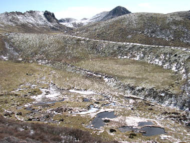 星生全景 星生山の麓には池糖(ちとう)があります。撮影した時間はまだ氷結していましたが、午後は解氷していたようです。 |