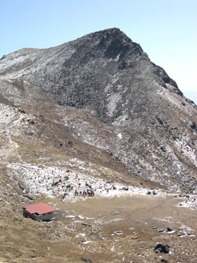 扇ガ鼻分岐より星生の方に向かました。山頂からの眺めは前日までの黄砂の影響も大きくはなく、この時期としてはとてもよく澄んでいたように感じました。間近に見る硫黄山の噴煙や残雪残る山肌など色の変化に富んだ素晴らしい眺めを満喫して星生崎、久住別れを経由して中岳に向かいました。中岳の真下にある御池は半分程度解氷しており、近くで休憩していると氷のきしむ音や氷の下に入り込んでいた空気の湧き出す音など心地の良い音が聞こえていました。中岳山頂には誰も居らず、午後の心地よい日差しを浴びて大岩の上で寝そべっていると、つい気持ち良くなってウトウトとしてしまい、予想以上に時間を過ごしてしまった為に天狗が城には寄らず、久住山へと向かいました。久住山でも久住高原の穏やかな眺めと日差しの為に再度ウトウトと居眠ってしまい、下山を開始したのは日が傾いてきてやや風が冷たくなってきた夕方になりました。